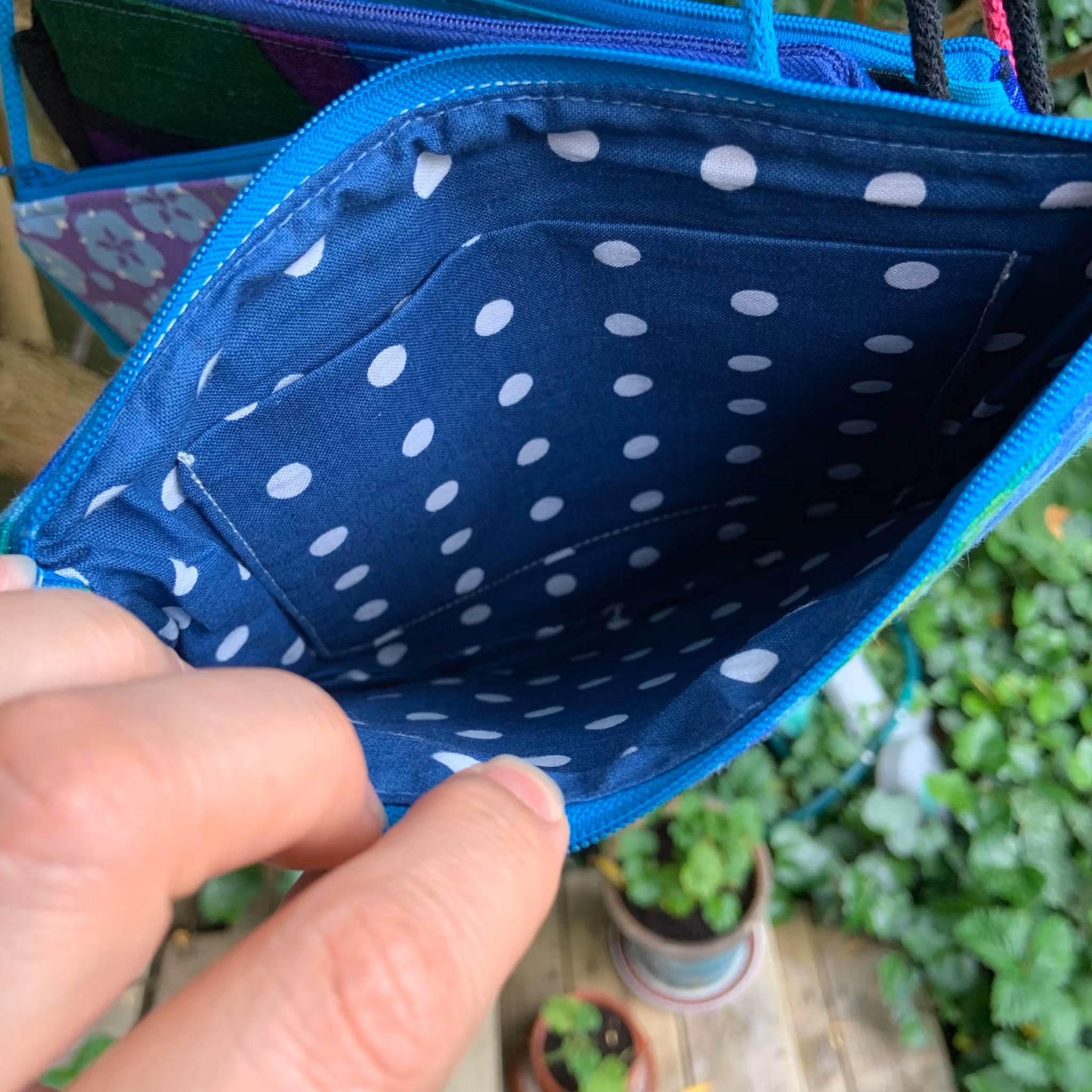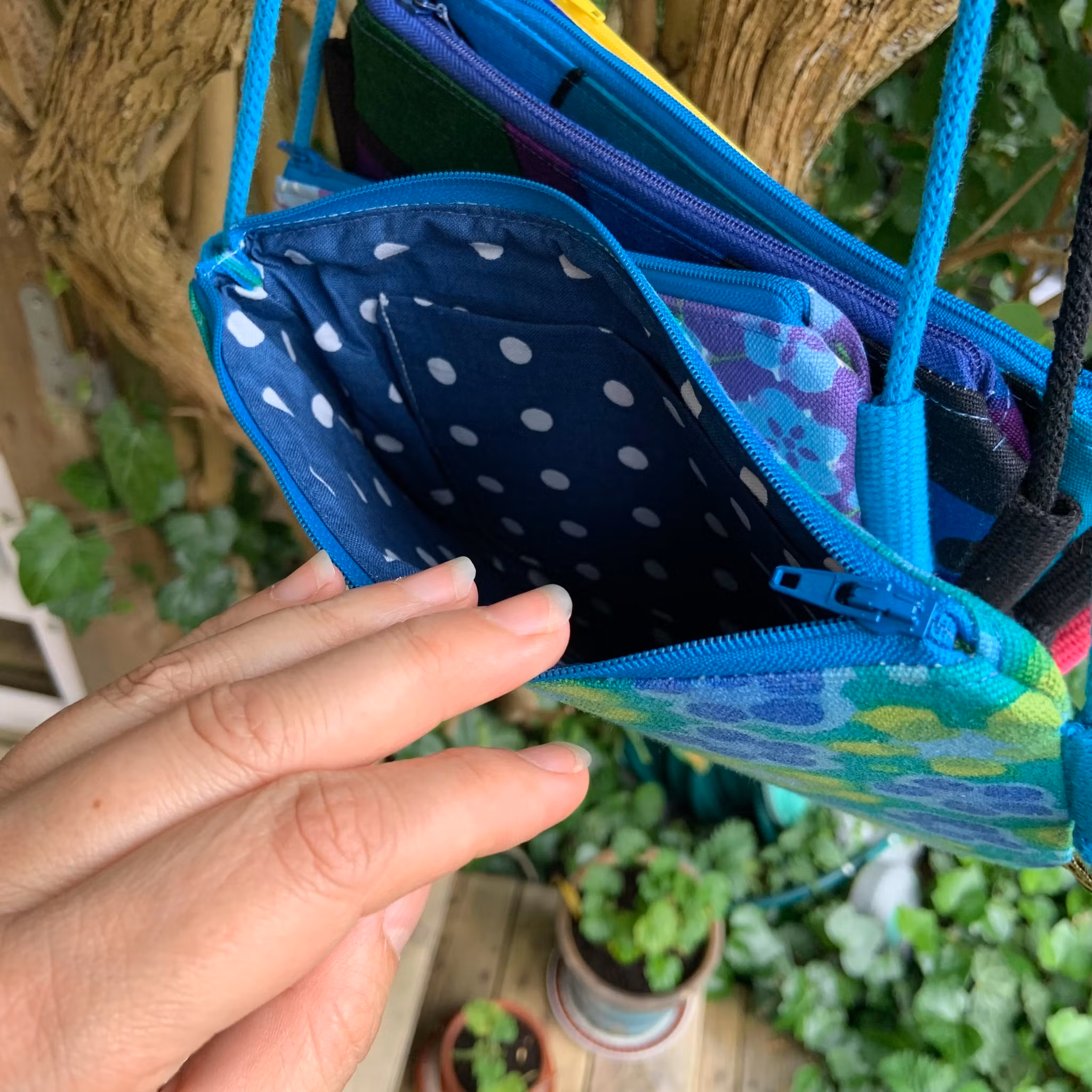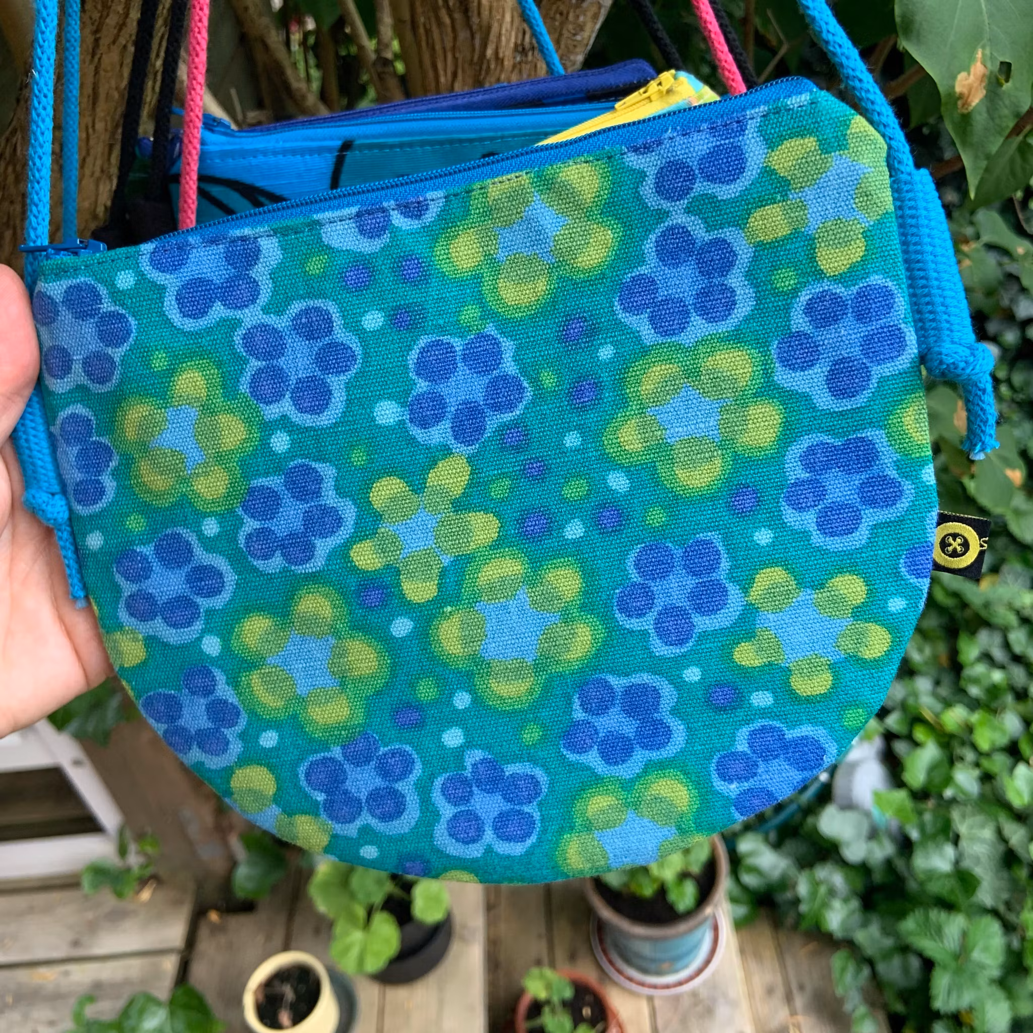 En liten väska formad som en halvcirkel. Denna väska är sydd i ett tyg av Mona Björk som är helt fantastiskt. Väskan är uppstärkt med riktigt kraftigt mellanlägg för att hålla formen fint och stängs med dragkedja. Fodrad med ett äldre tyg och har en liten ficka på insidan för småsaker.