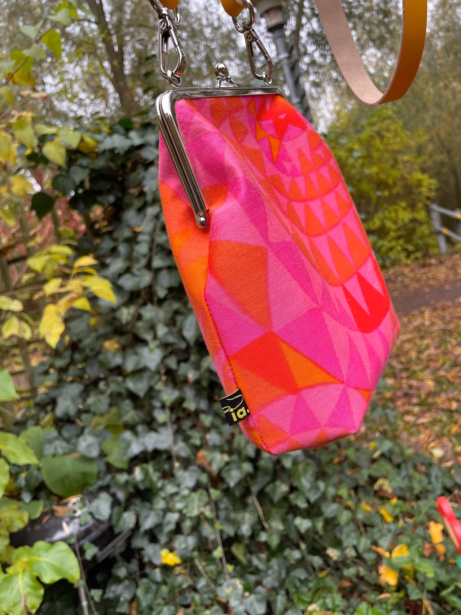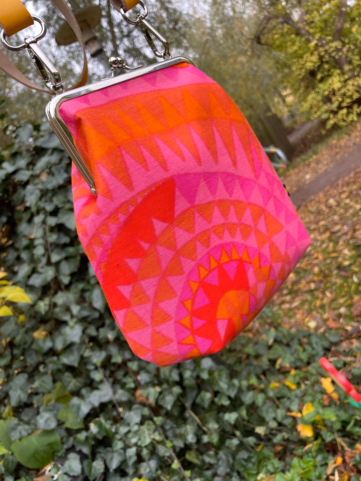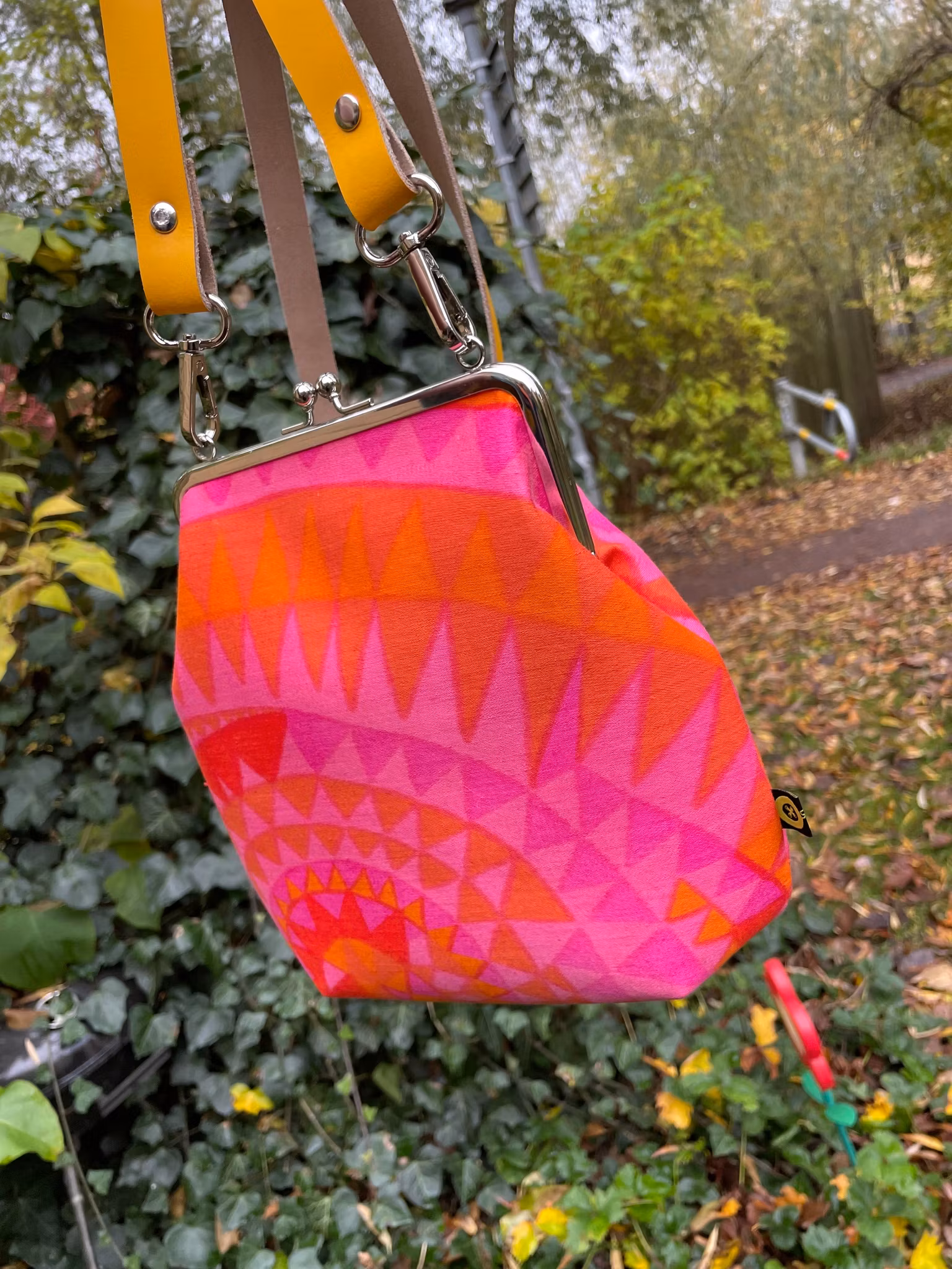 Väska sydd i Marjatta Metsovaaras tyg ”Simpukka”. Tyget är från en gammal gardin och möjligtvis lite blekt från originalet, vet inte säkert, men färgerna är starka och underbara!