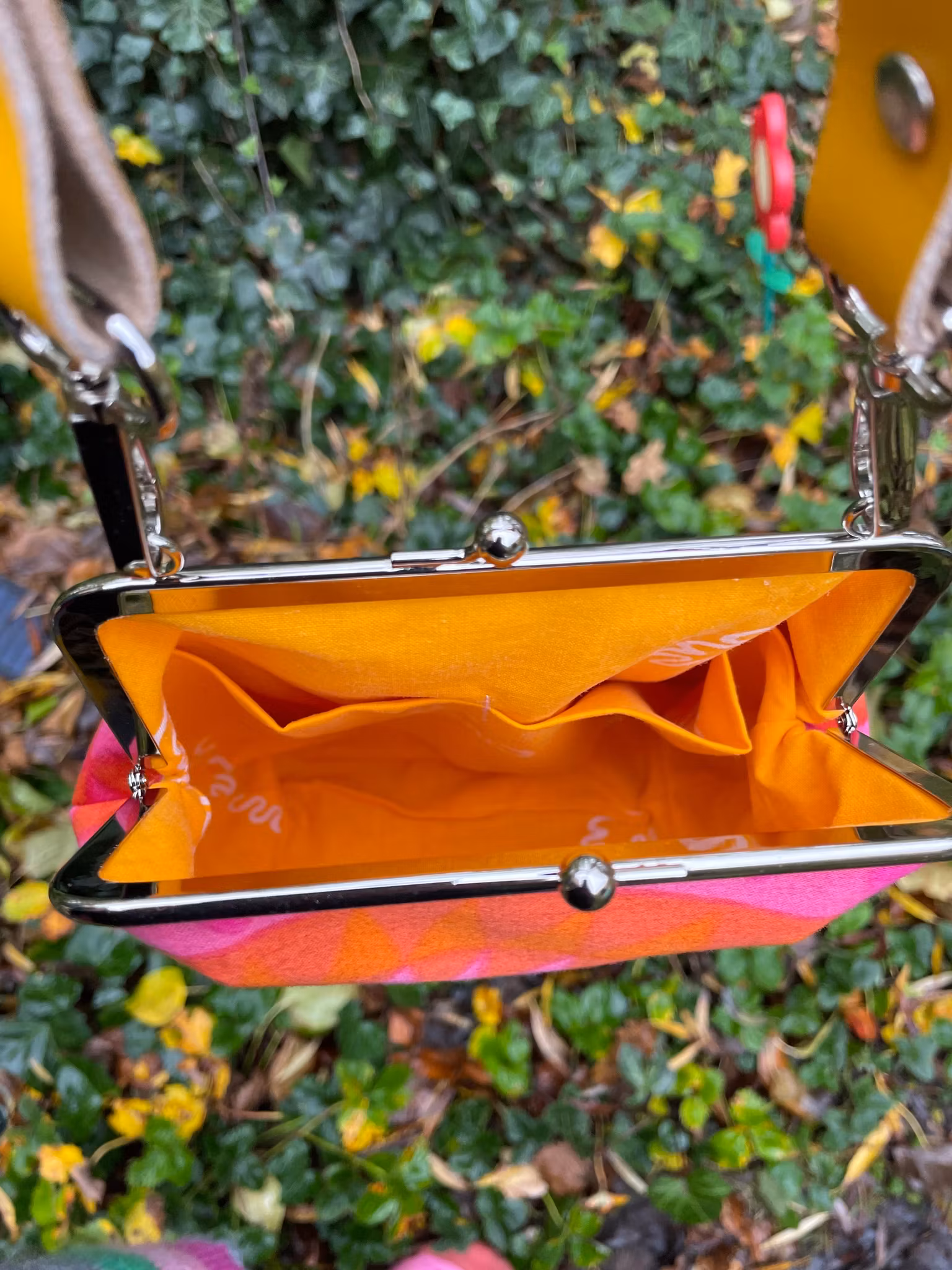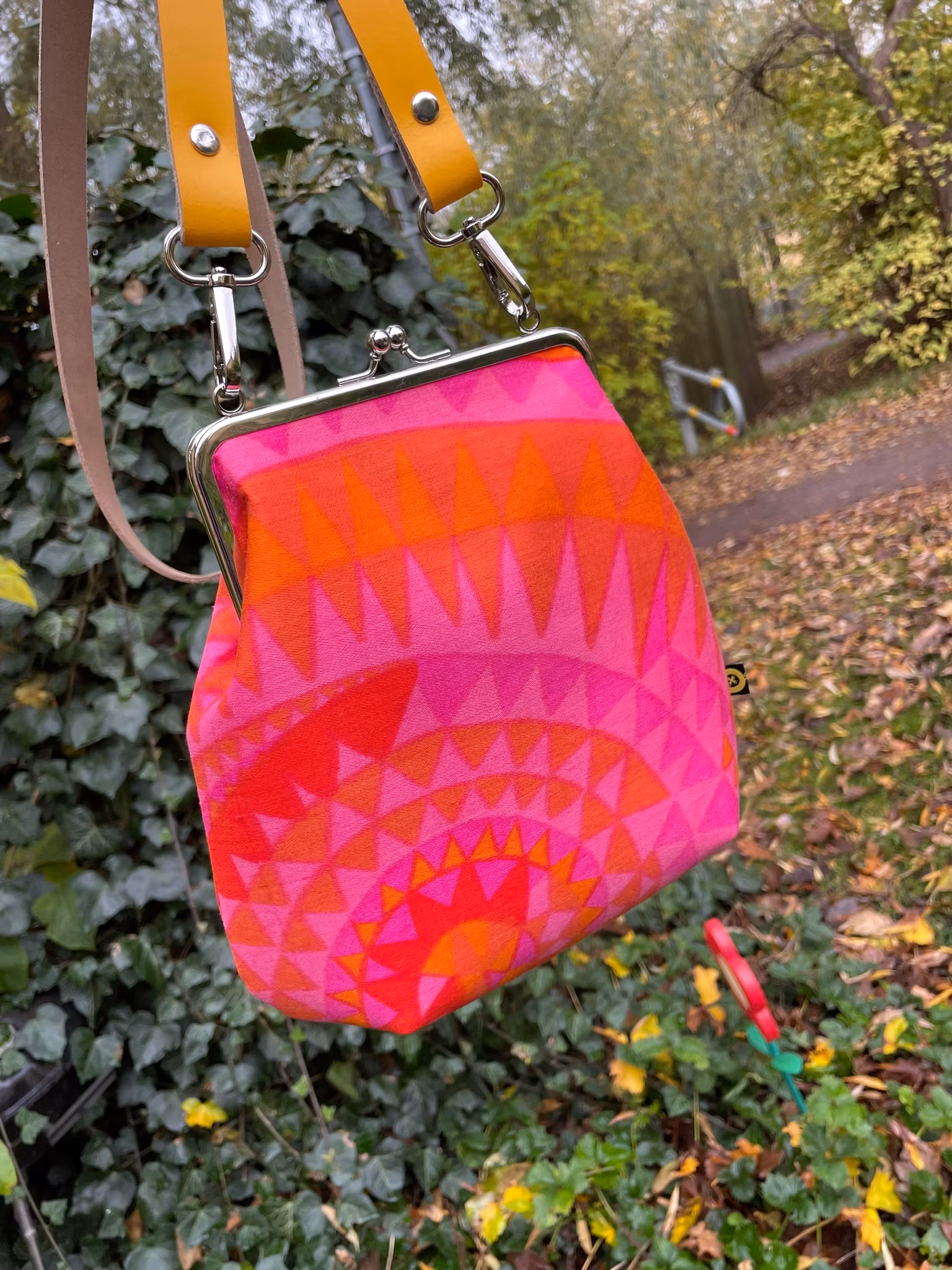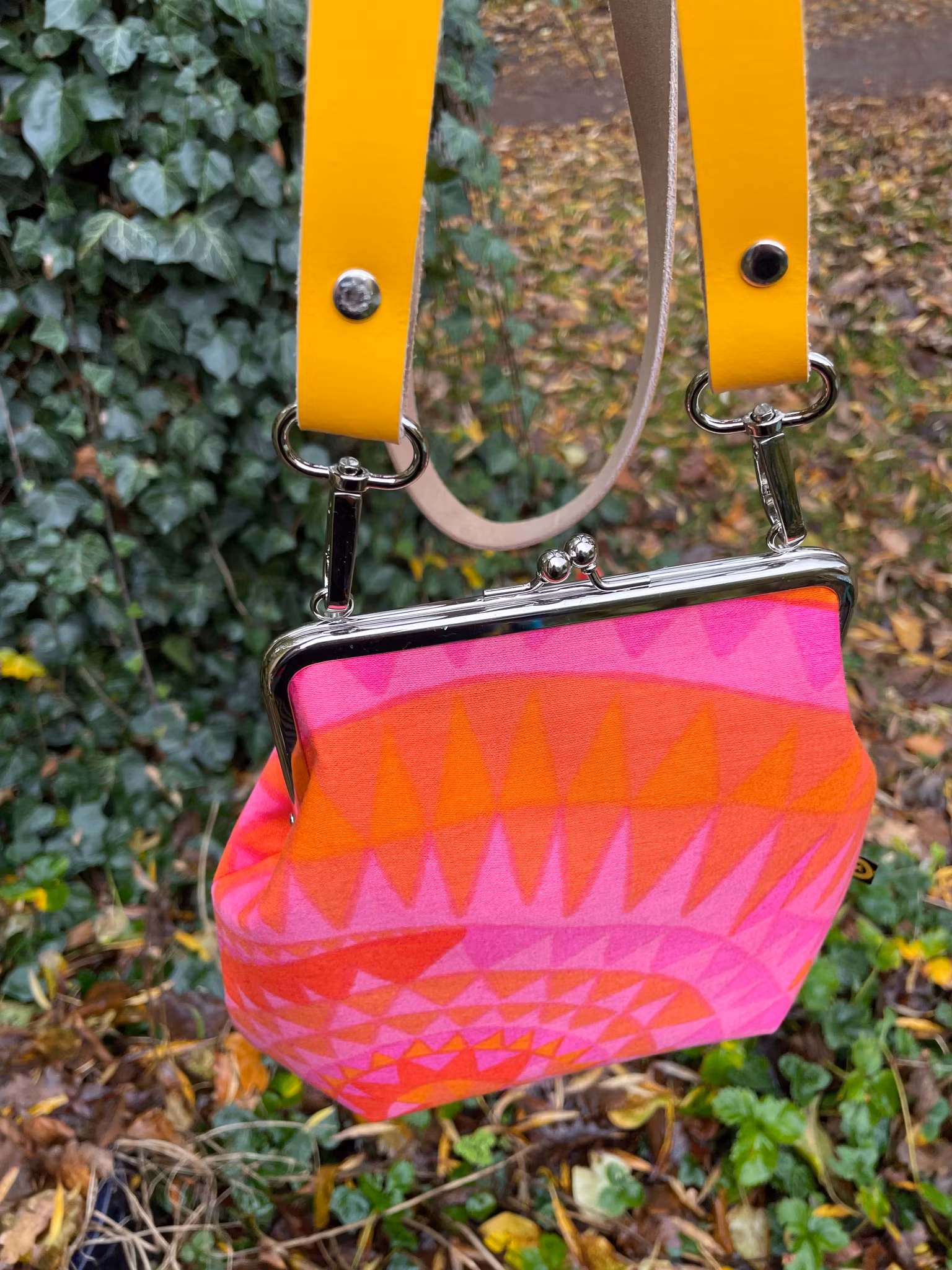 Väskan är stärkt med riktigt kraftigt mellanlägg för att hålla form och stadga fint och har avsydda hörn i botten för att rymma mer. Axelbandet i klargult läder, 20 mm brett, ingår. Remmen är inte ställbar utan har en fast längd på 120 cm (inkl. spännena). Men det går självklart fint att välja en rem i bomull istället, skriv det i så fall som en kommentar när du köper. Väskan är fodrad med tunnare tyg och har två fack för småsaker, mobil och nycklar.