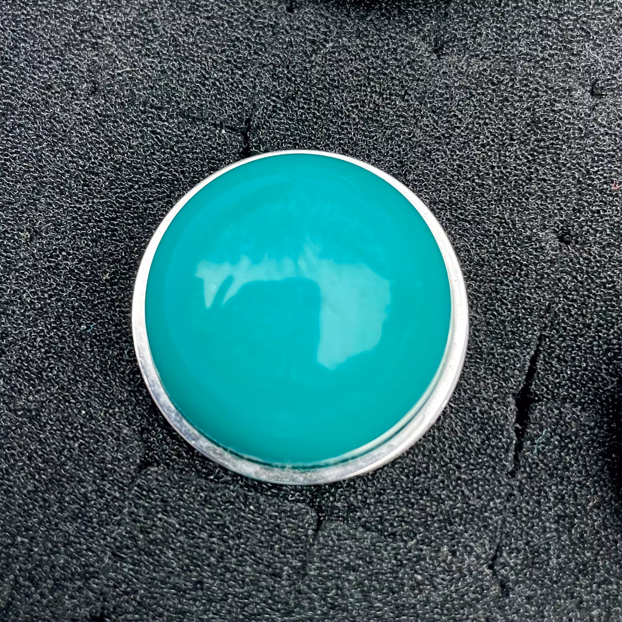 Handgjuten ring i resin och rostfritt stål. Själva halvklotet är handgjutet i plast och infärgat av mig, och storleken är 25 mm (i diameter). Stommen