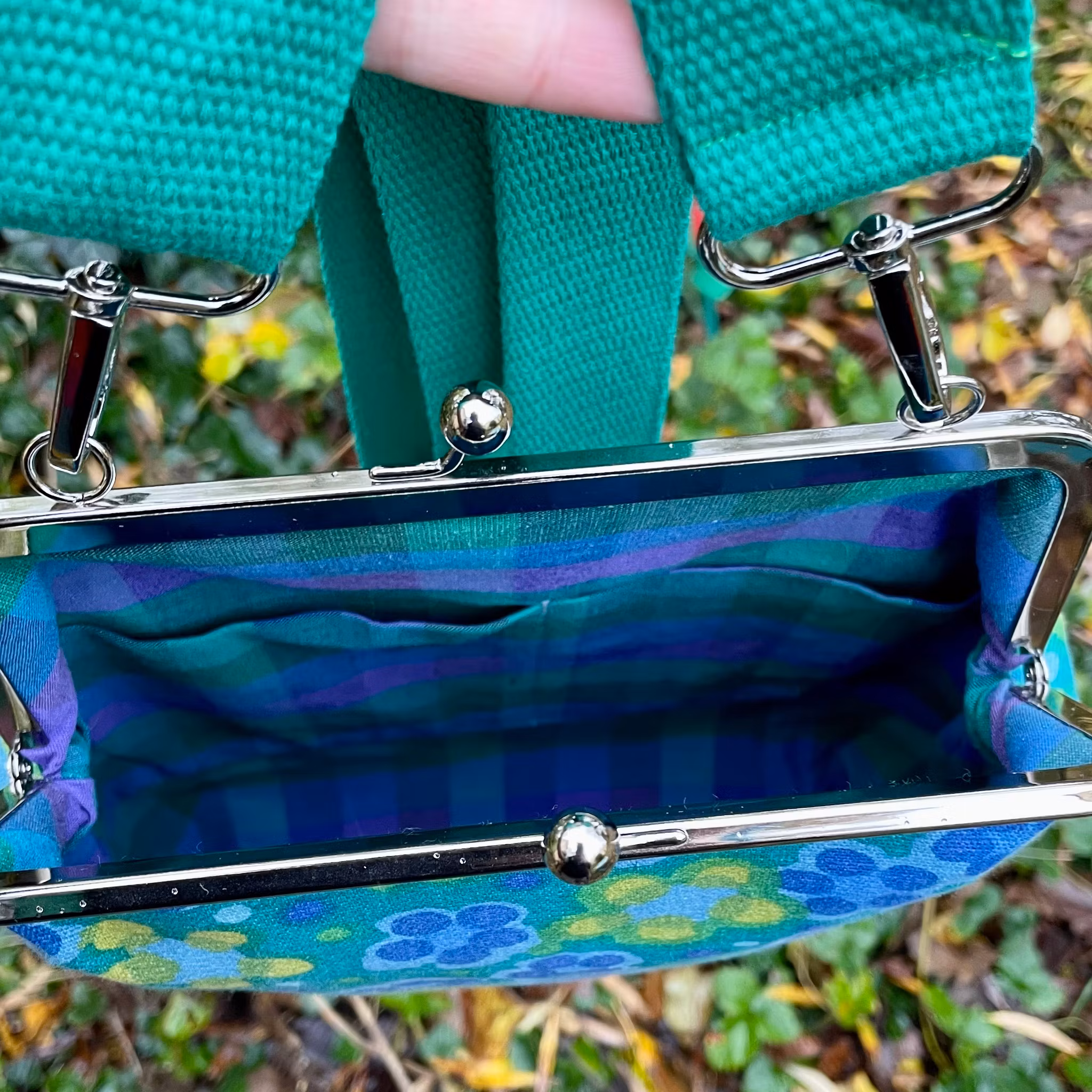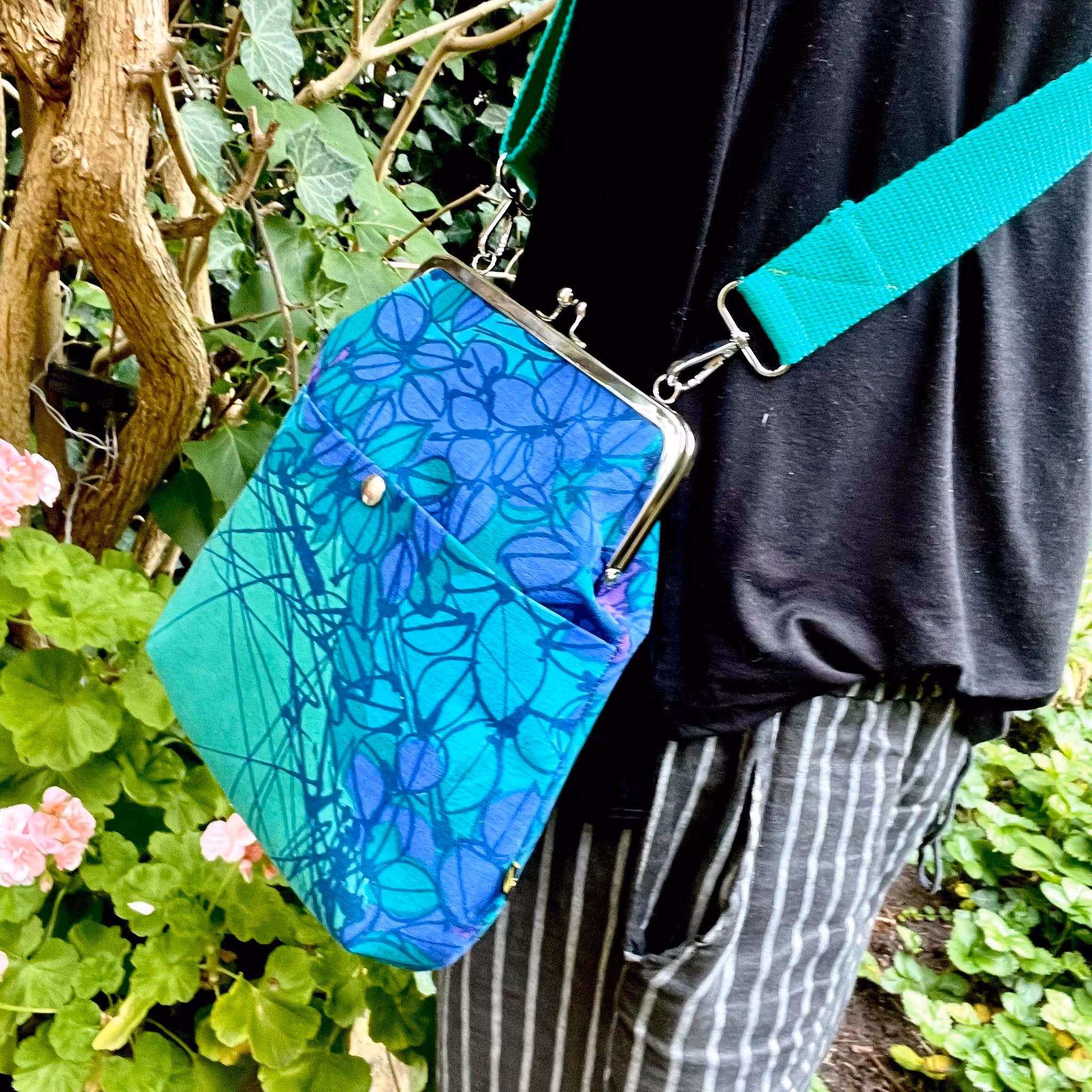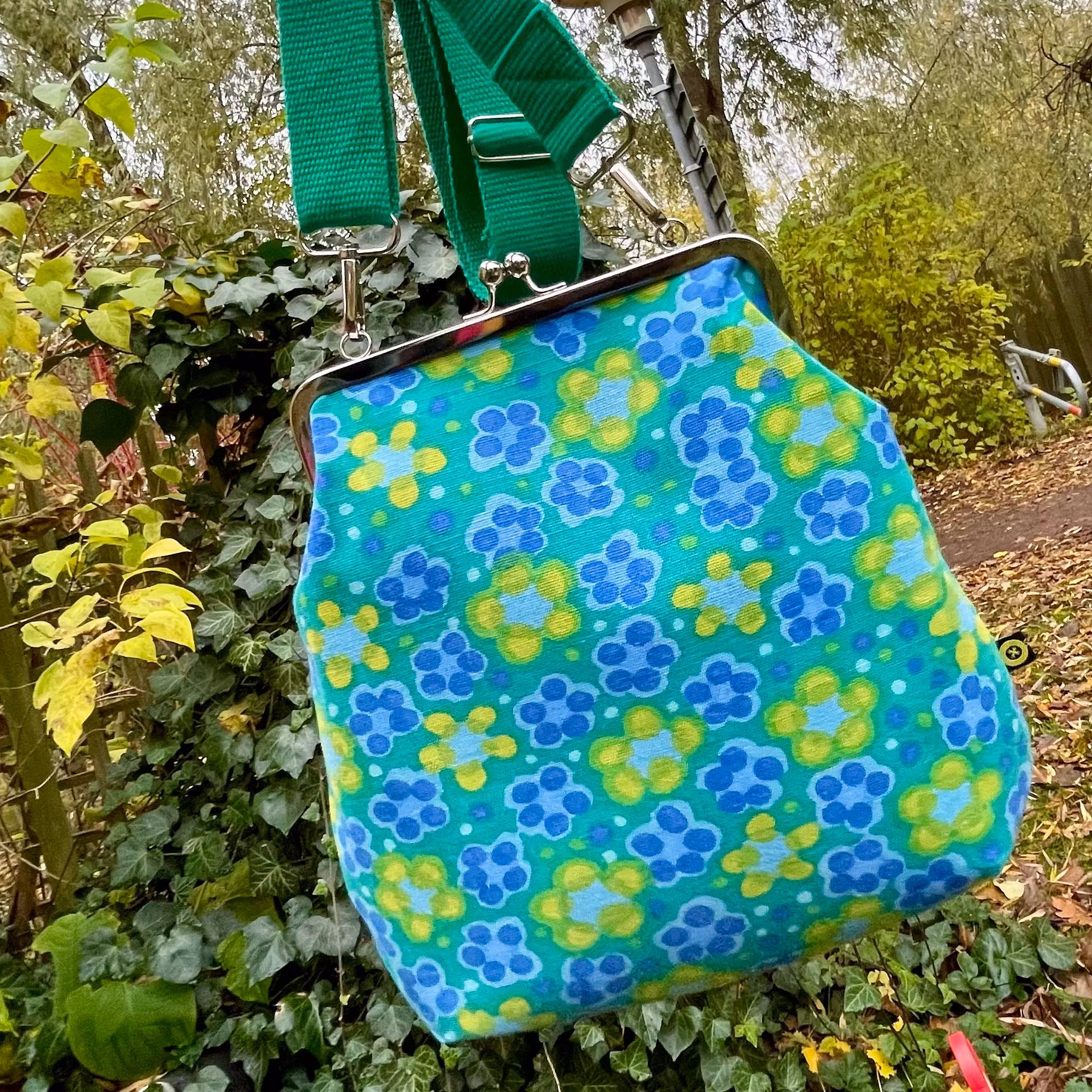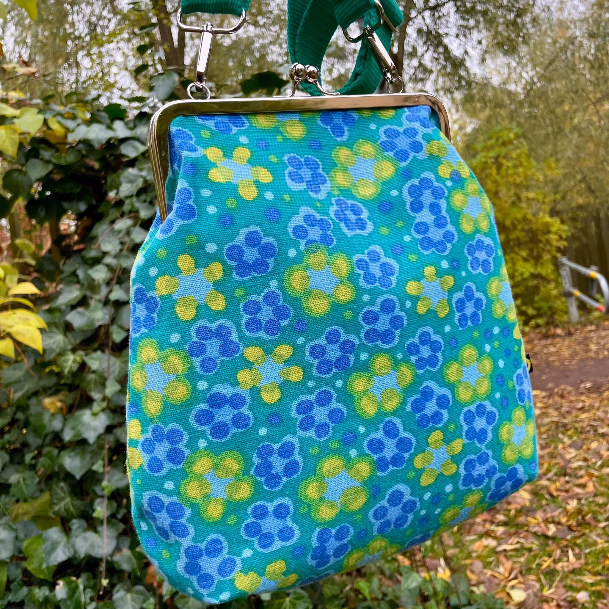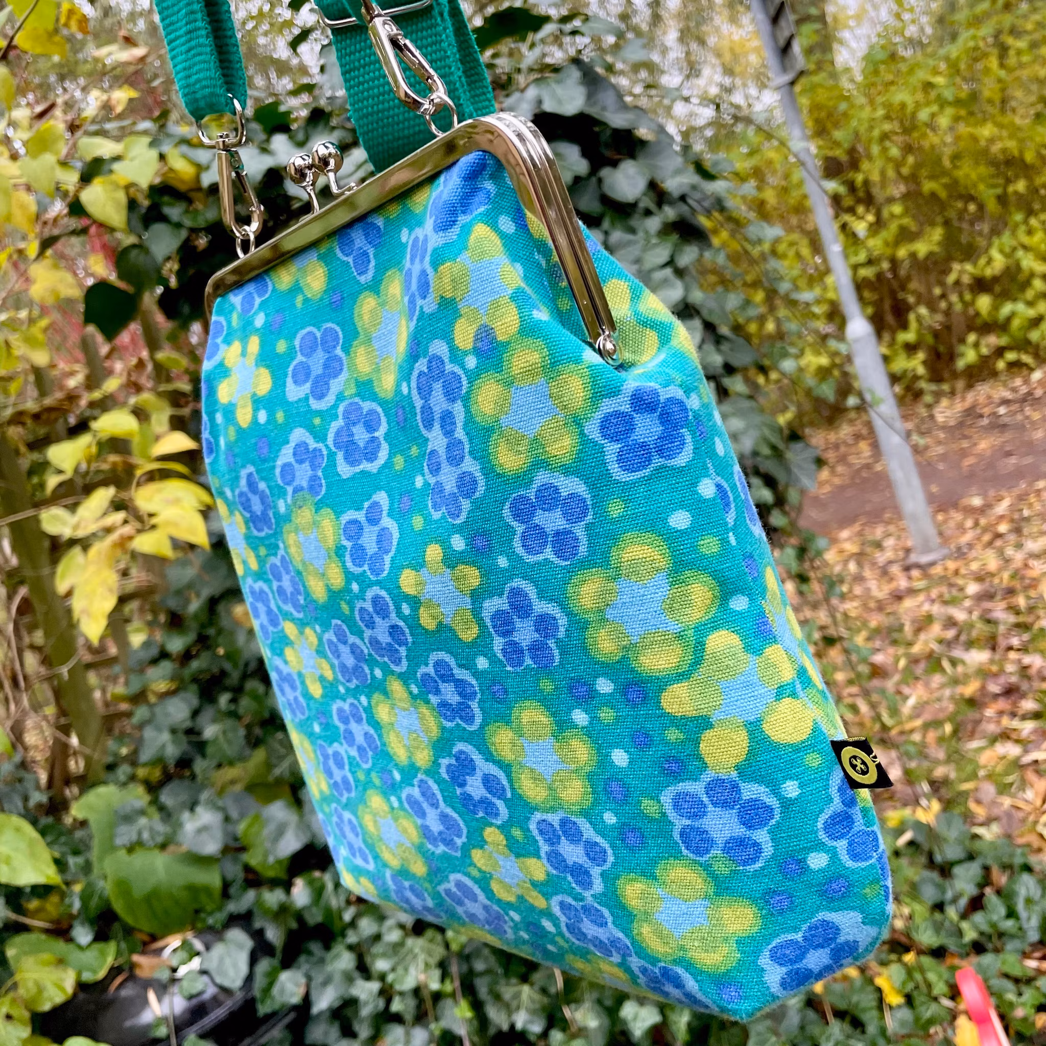 Väska sydd i ett underbart, kraftigare tyg av Mona Björk. Fantastiska färger och tyg i superskick.