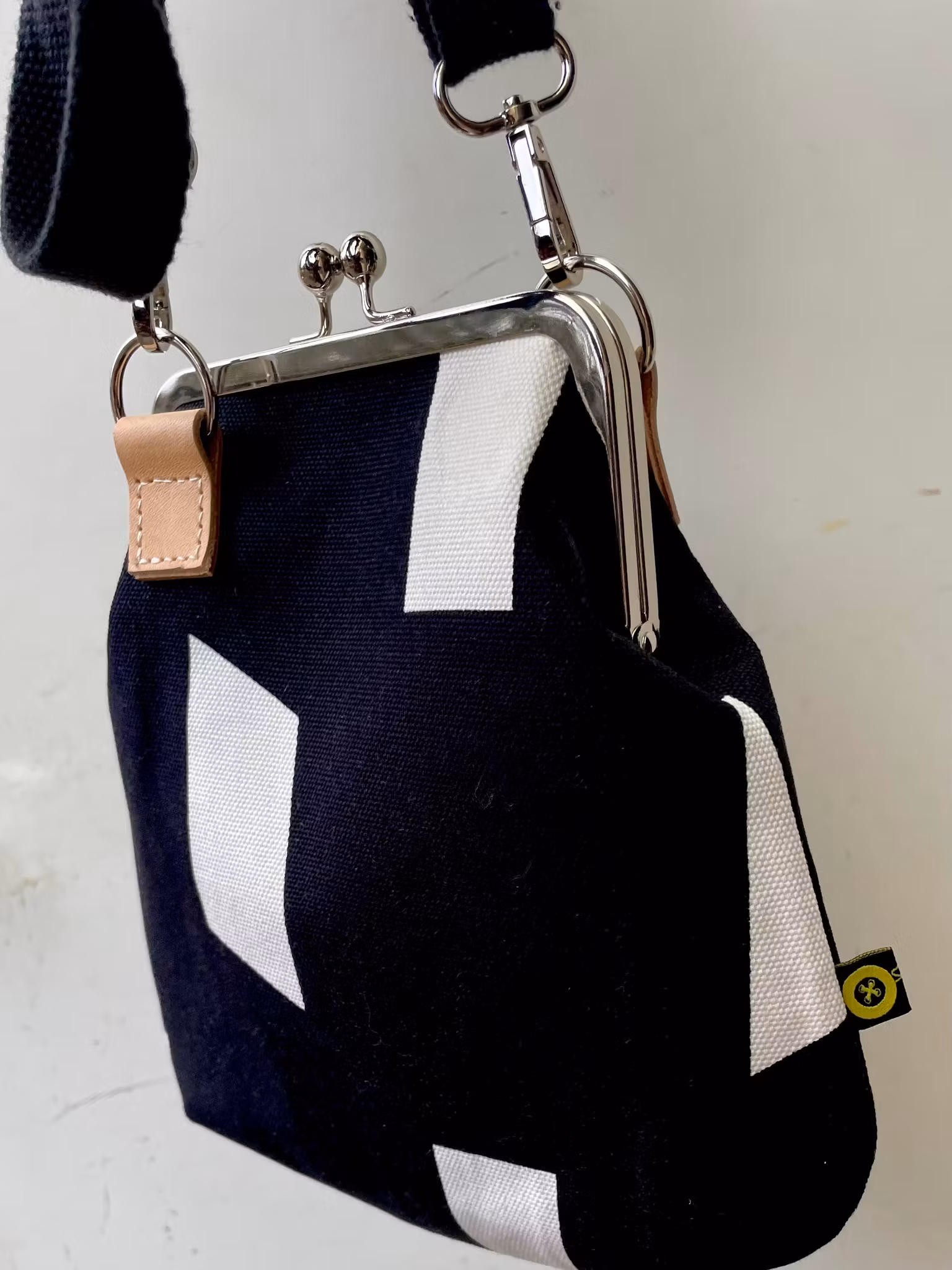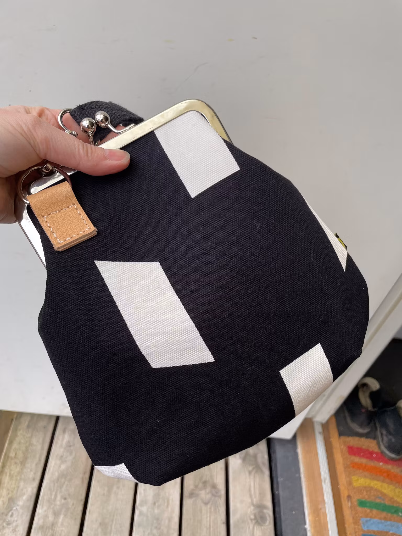 Väskan är stärkt med riktigt kraftigt mellanlägg för att hålla form och stadga fint och har avsydda hörn i botten för att rymma mer. Axelbandet fästs i ringar som är fastsydda med naturfärgade läderbitar. Detta gör att man kan använda väskan med valfri sida som framsida. Reglerbart axelband i bomull, 25 mm brett. På bilden har jag en svart rem men det går naturligtvis bra att välja rem i annan färg. Det går också att få en rem i läder, den kostar i så fall 200:- extra. Skriv en kommentar om du önskar läderrem så fixar vi betalningen i efterhand. Väskan är fodrad med ett tunnare, återbrukat tyg och har två fack för småsaker, mobil och nycklar.
