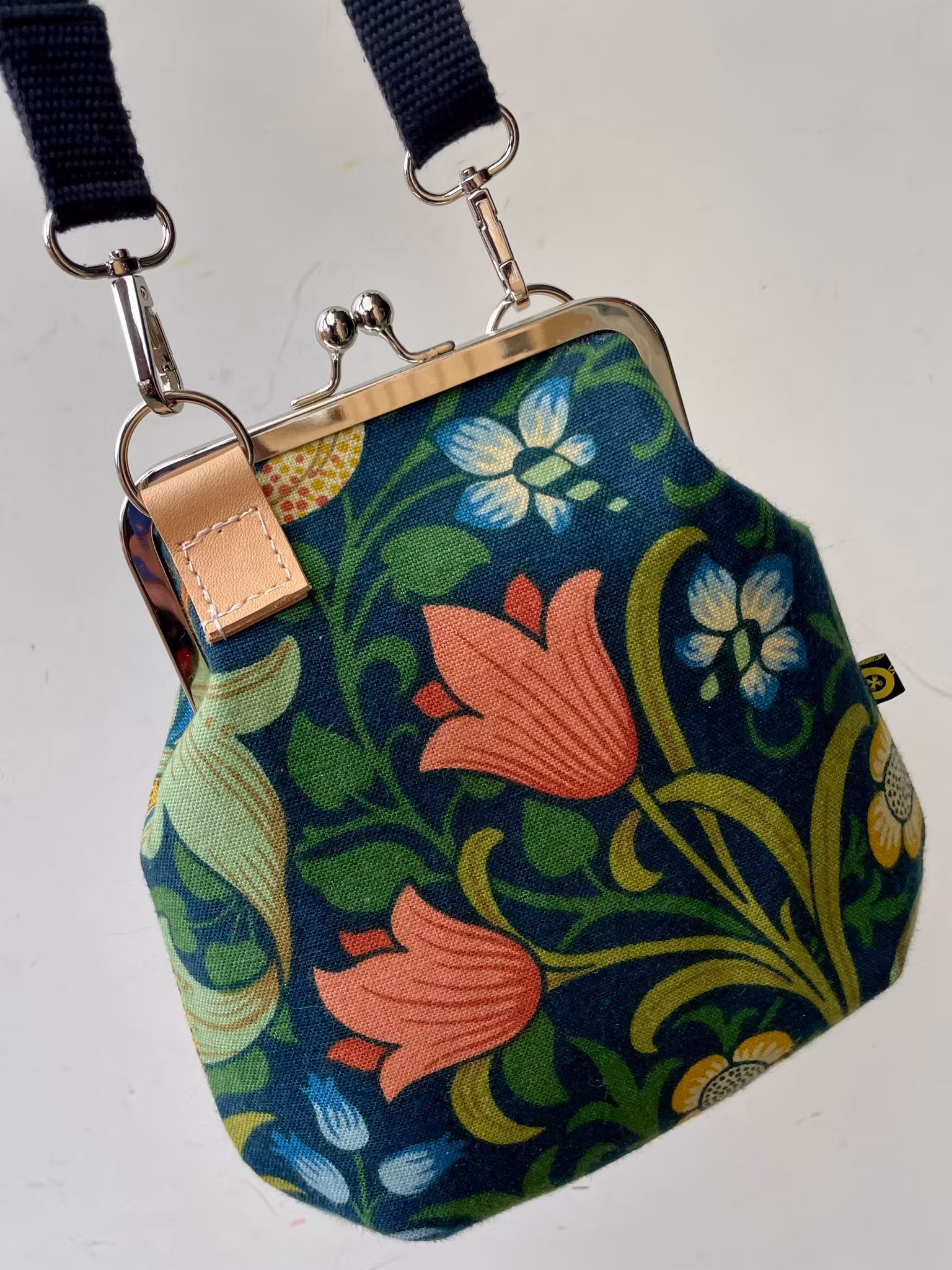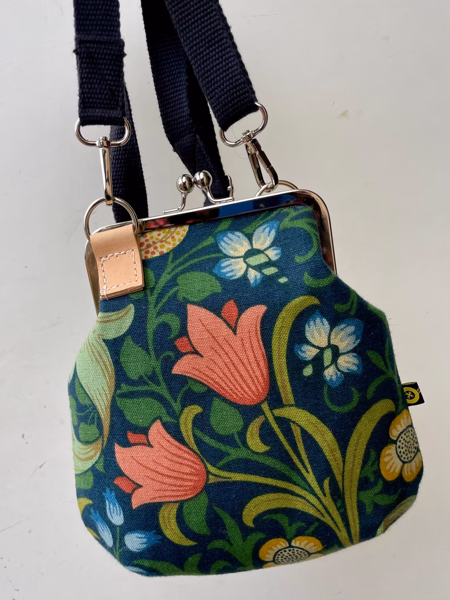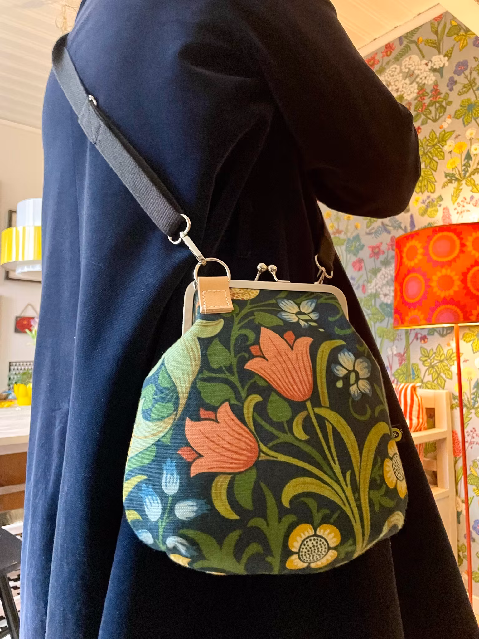 Väska sydd i ett nytt tyg ”Golden Lily” av William Morris i linne. Väskan är stärkt med riktigt kraftigt mellanlägg för att hålla form och stadga fint och
